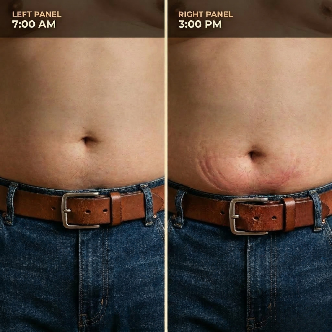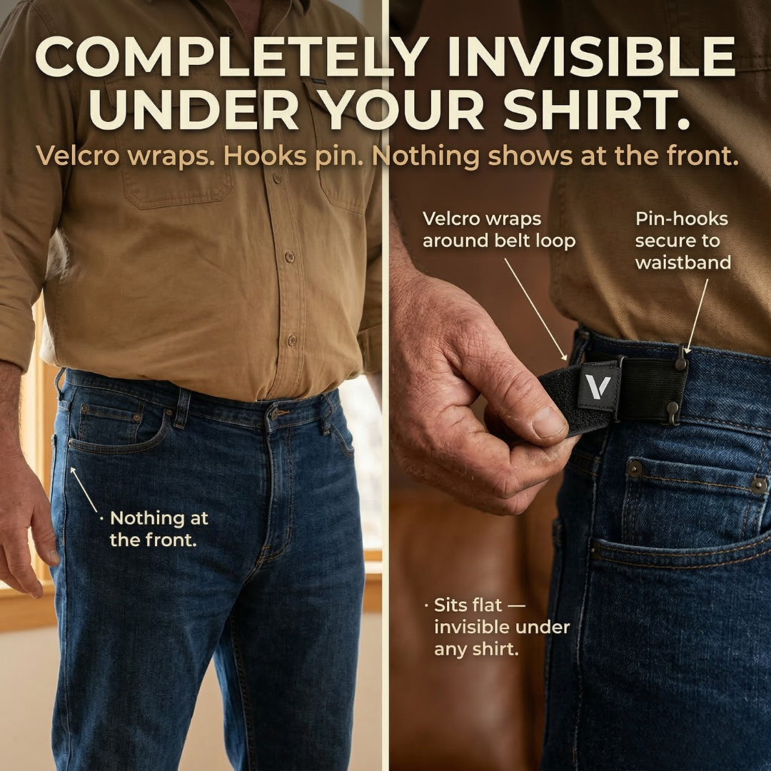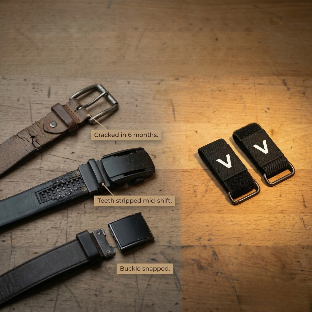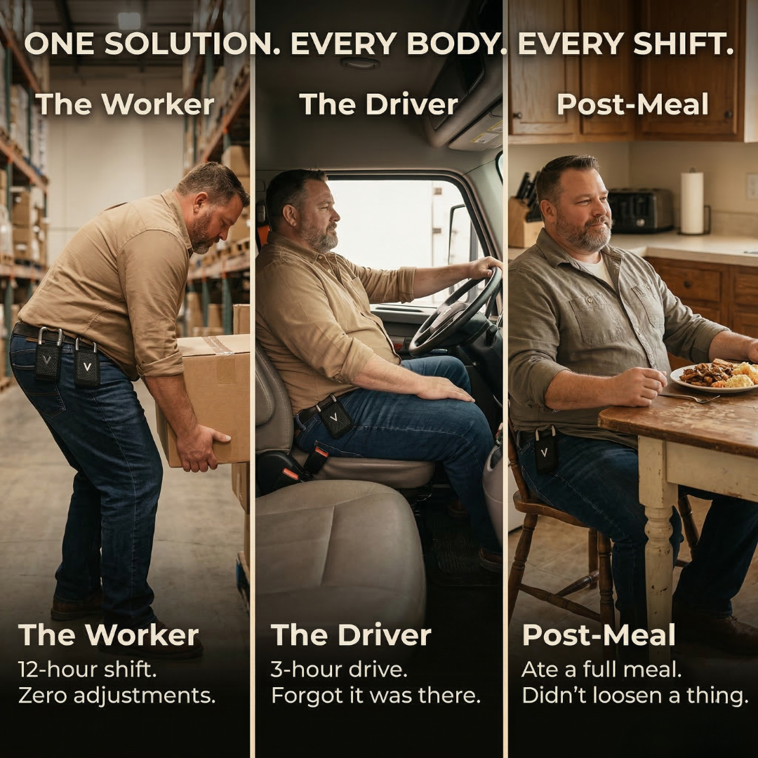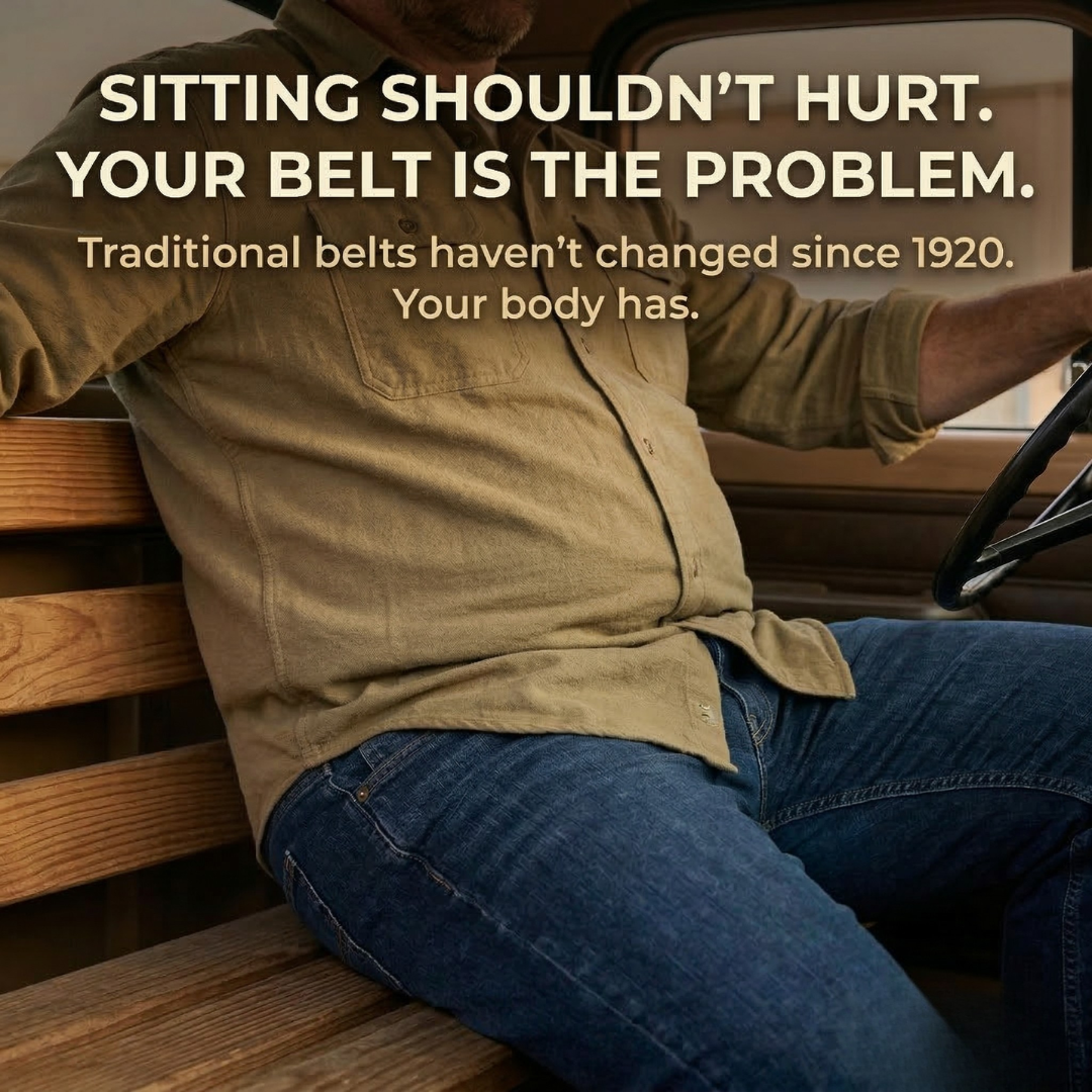 So you're permanently caught between holes: one too tight, one too loose, and by hour eight you're either in pain or your pants are slipping. The belt was never designed for how you actually live.