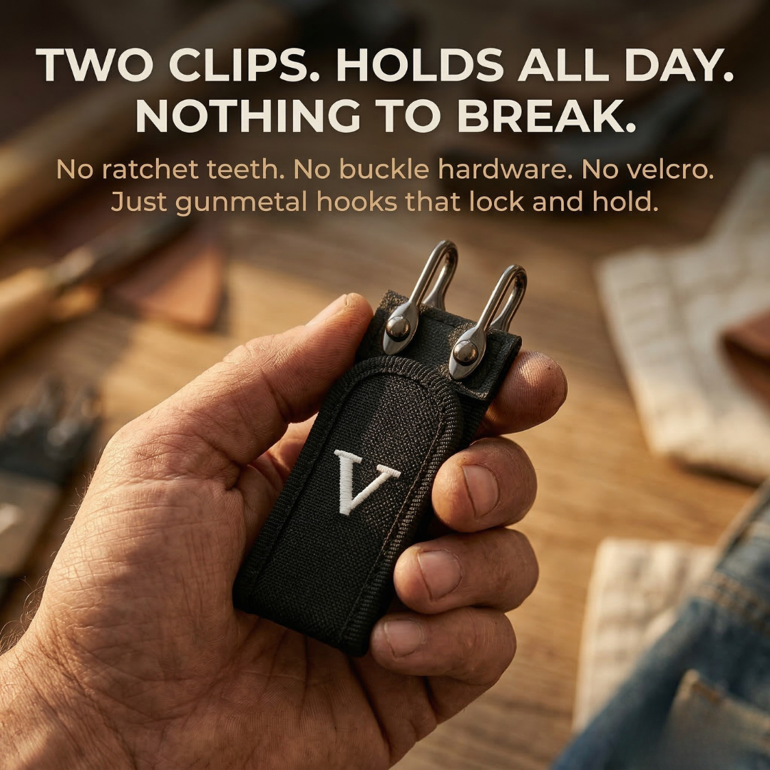 This belt has one working part, a military-grade metal hook, with nothing else to strip, snap, or fall apart. Fewer parts means fewer ways to fail.