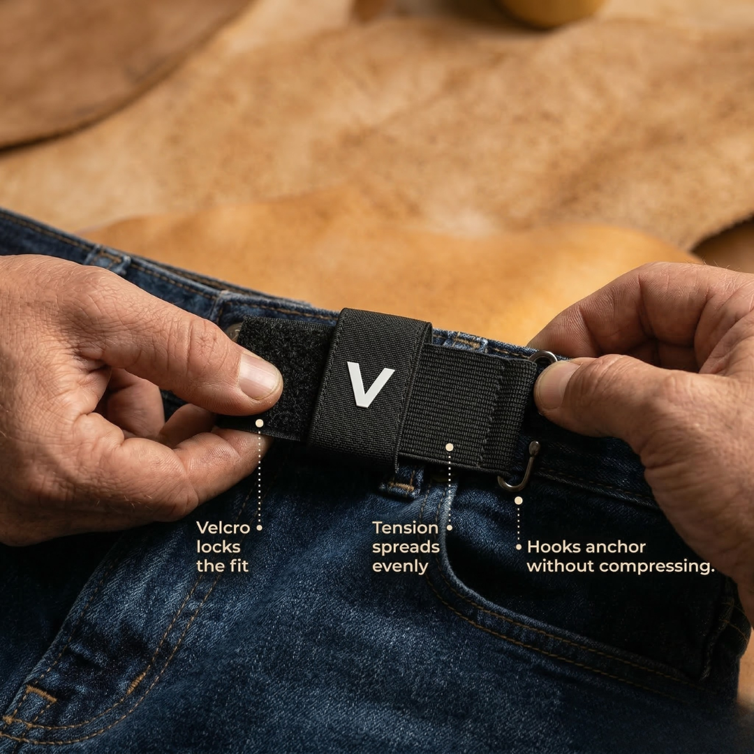 Traditional belts use a rigid prong jammed into a hole to hold tension at a single fixed point. The moment that point is wrong, and it always is eventually, you feel it immediately.